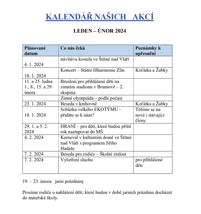 Úvod > O škole > Akce školky > Kalendář akcí na období Leden - Březen 2024