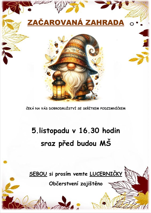 Milí rodiče, srdečně vás zveme na akci "Začarovaná zahrada", která proběhne 5.11. od 16:30 hodin na zahradě MŠ. S sebou si vezměte lucerničku, občerstvení je zajištěno. Těšíme se na vás!