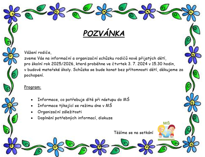 Úvod > Aktuality > Informační schůzka pro rodiče nově přijatých dětí