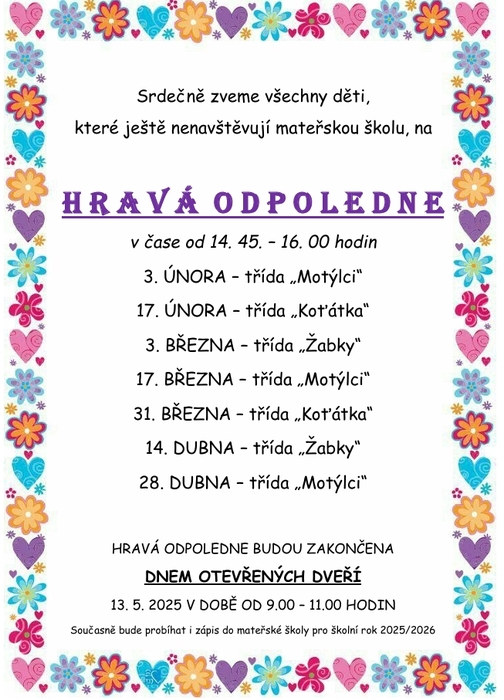 Srdečně zveme všechny děti, které ještě nenavštěvují mateřskou školu, na H R A V Á  O D P O L E D N E v čase od 14. 45. – 16. 00 hodin.