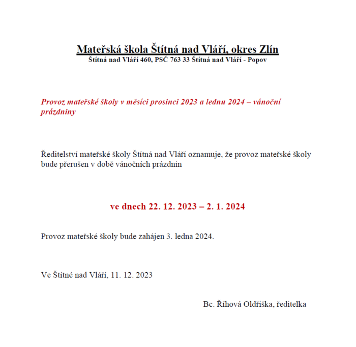 Úvod > Aktuality > Provoz mateřské školy během Vánoc