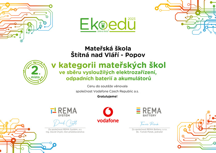 Již druhým rokem se naše školka zapojila do sběrové soutěže s názvem EkoEDA. V letošním roce jsme se díky vám všem umístili na úžasném 2.místě. Velmi děkujeme všem, kteří čímkoliv přispěli k tomuto krásnému umístění :)