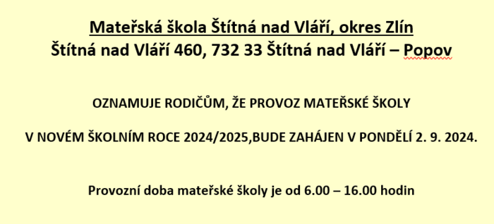 Úvod > Aktuality > Zahájení provozu MŠ v novém školním roce 2024/2025